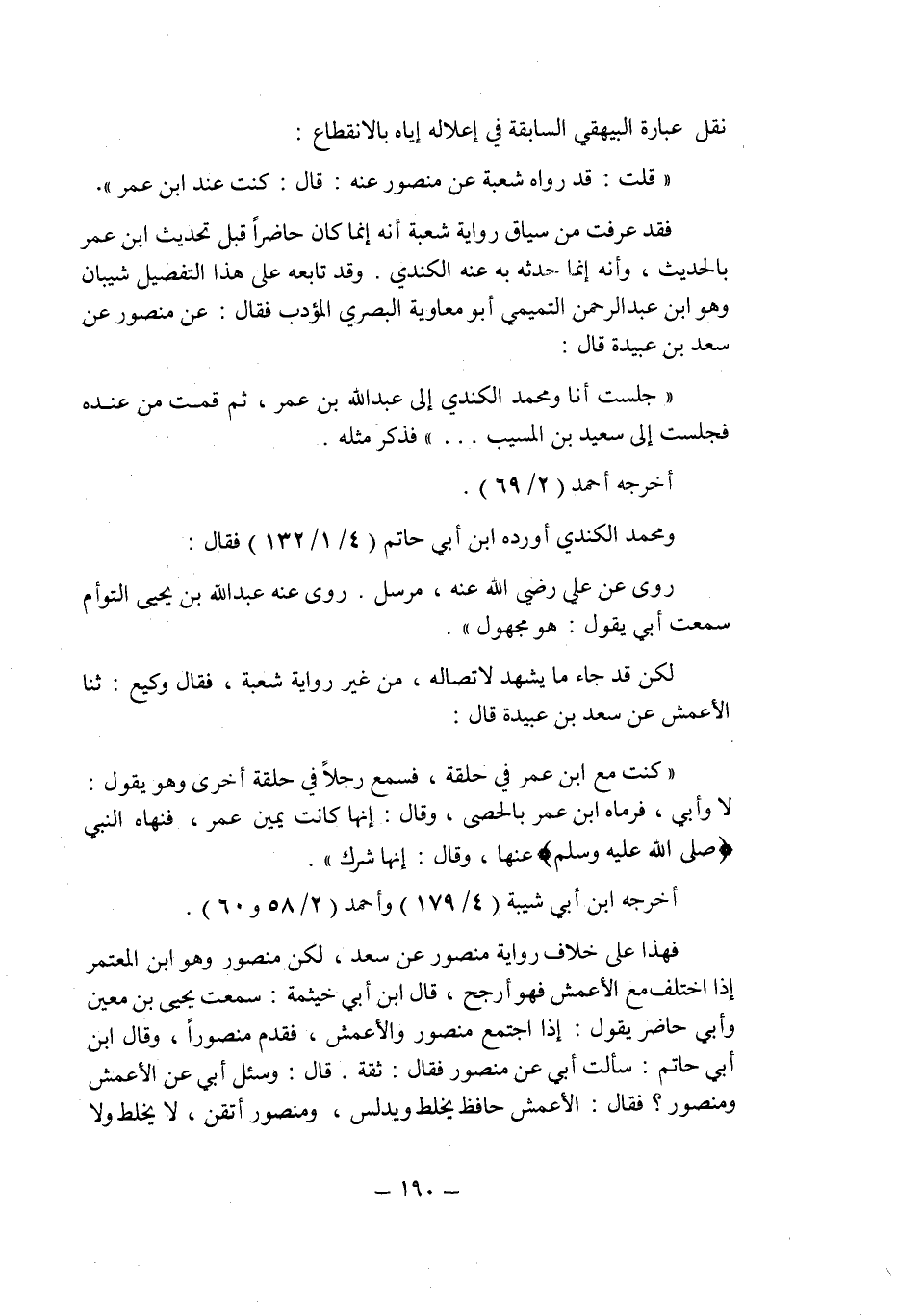لكن قد جاء ما يشهد لاتصاله , من غير رواية شعبة , فقال وكيع: حدثنا الأعمش عن سعد بن عبيدة قال: " كنت مع ابن عمر فى حلقة , فسمع رجلا فى حلقة أخرى وهو يقول: لا وأبى , فرماه ابن عمر بالحصى , وقال: إنها كانت يمين عمر , فنهاه النبى صلى الله عليه وسلم عنها , وقال: إنها شرك ".