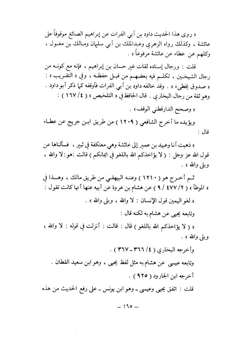 ثم أخرج هو (1210) وعنه البيهقى من طريق مالك , وهذا فى " الموطأ " (2/477/9) عن هشام بن عروة عن أبيه عنها كانت تقول: " لغو اليمين قول الإنسان: لا والله , وبلى والله ".
