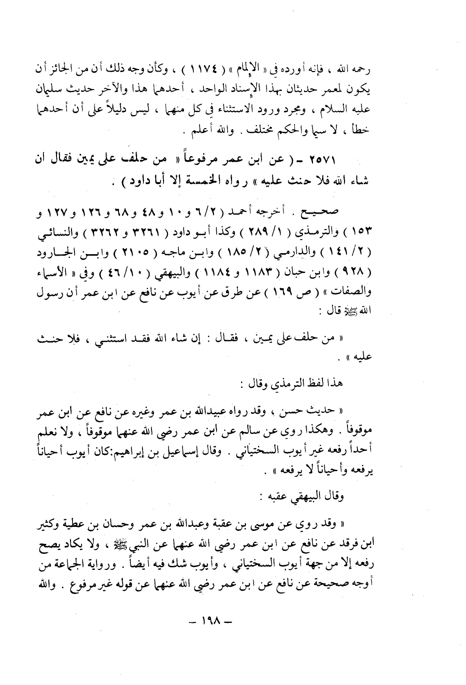 (2571) - (عن ابن عمر مرفوعا: " من حلف على يمين فقال إن شاء الله فلا حنث عليه " رواه الخمسة إلا أبا داود.