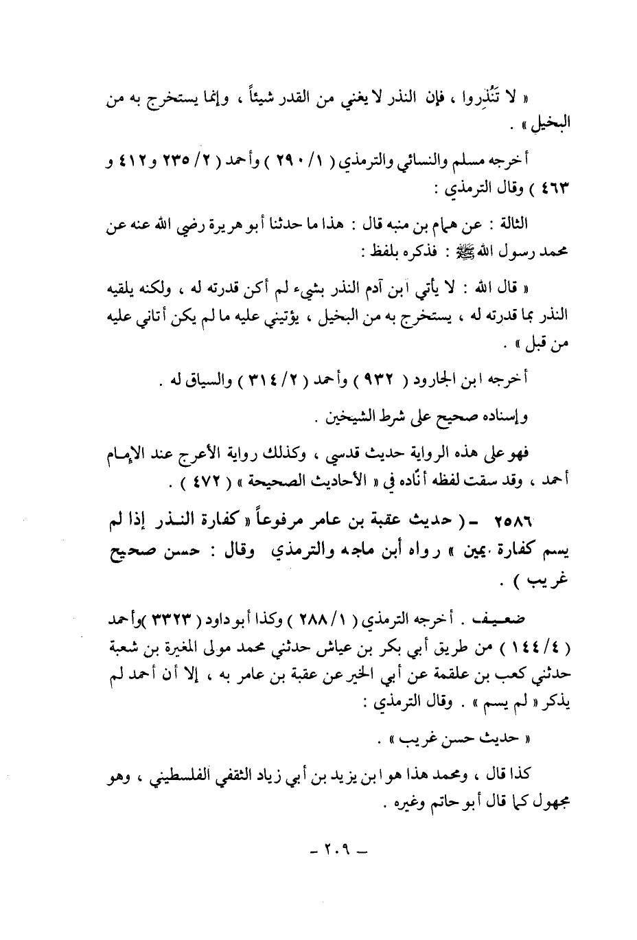 الثالثة: عن همام بن منبه قال: هذا ما حدثنا أبو هريرة رضى الله عنه عن محمد رسول الله صلى الله عليه وسلم: فذكره بلفظ: " قال الله: لا يأتى ابن آدم النذر بشىء لم أكن قدرته له , ولكنه يلقيه النذر بما قدرته له , يستخرج به من البخيل , يؤتينى عليه ما لم يكن أتانى عليه من قبل " أخرجه ابن الجارود (923) وأحمد (2/314) والسياق له.