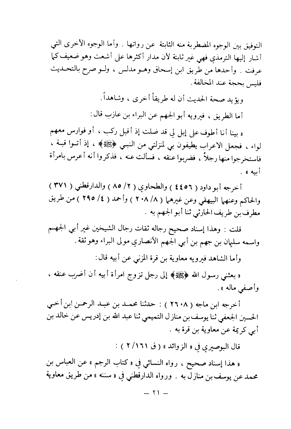 أما الطريق , فيرويه أبو الجهم عن البراء بن عازب قال: " بينا أنا أطوف على إبل لى قد ضلت إذا أقبل ركب , أو فوارس معهم لواء , فجعل الأعراب يطيفون بى لمنزلتى من النبى صلى الله عليه وسلم , إذا أتوا قبة , فاستخرجوا منها رجلا , فضربوا عنقه , فسألت عنه , فذكرو أنه أعرس بامرأة أبيه " أخرجه أبو داود (4456) والطحاوى (2/85) والدارقطنى (371) والحاكم وعنهما البيهقى وعن غيرهما (8/208) وأحمد (4/295) من طريق مطرف بن طريف الحارثى حدثنا: أبو الجهم به.