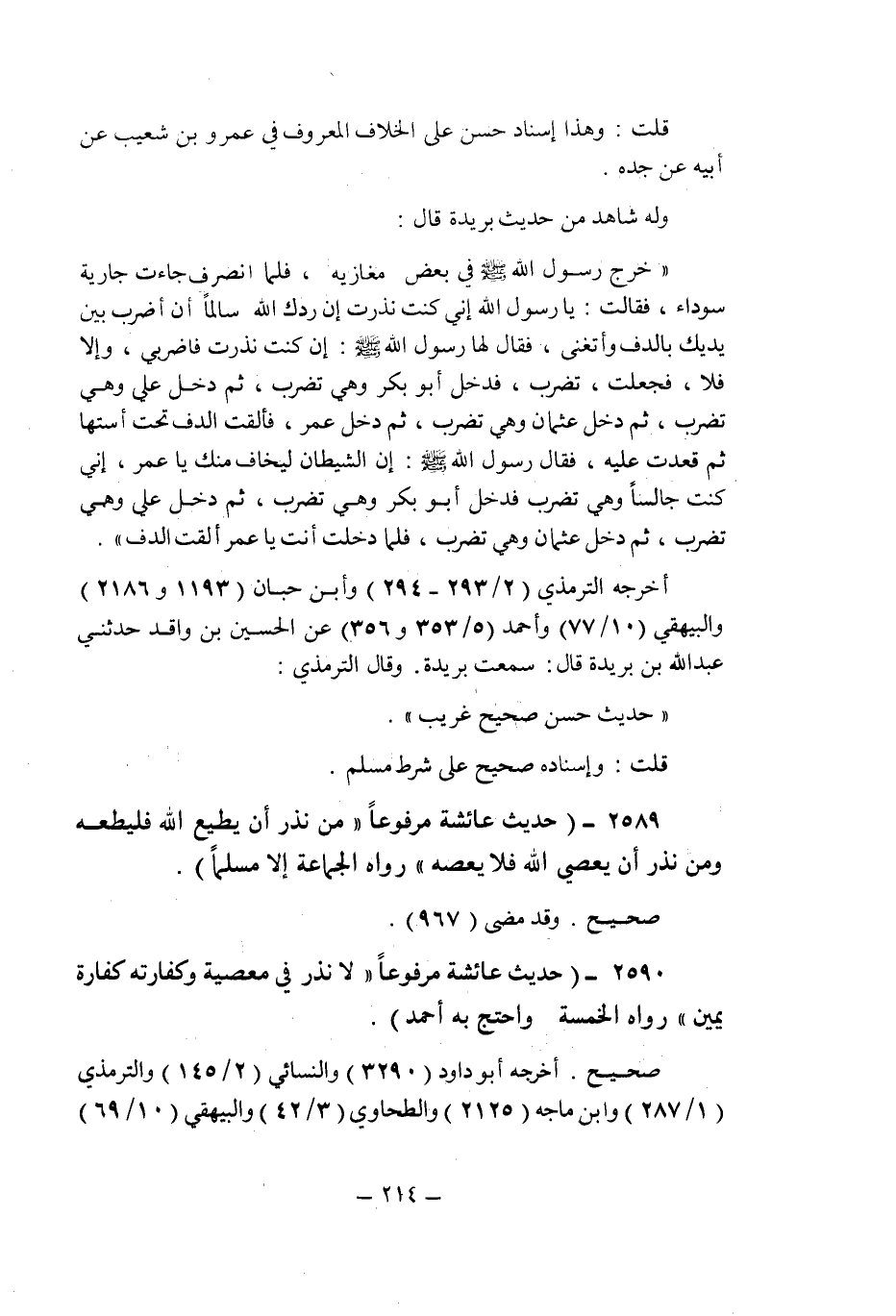 وله شاهد من حديث بريدة قال: " خرج رسول الله صلى الله عليه وسلم فى بعض مغازيه , فلما انصرف جاءت جارية سوداء , فقالت: يا رسول الله إنى كنت نذرت إن ردك الله سالما أن أضرب بين يديك بالدف وأتغنى , فقال لها رسول الله صلى الله عليه وسلم: إن كنت نذرت فاضربى , وإلا فلا , فجعلت , تضرب , فدخل أبو بكر وهى تضرب , ثم دخل على وهى تضرب , ثم دخل عثمان وهى تضرب , ثم دخل عمر , فألقت الدف تحت استها ثم قعدت عليه , فقال رسول الله صلى الله عليه وسلم: إن الشيطان ليخاف منك يا عمر , إنى كنت جالسا وهى تضرب فدخل أبو بكر وهى تضرب , ثم دخل على وهى تضرب , ثم دخل عثمان وهى تضرب , فلما دخلت أنت يا عمر ألقت الدف " أخرجه الترمذى (7/293 و294) وابن حبان (1193 و2186) والبيهقى (10/77) وأحمد (5/353 و356) عن الحسين بن واقد حدثنى عبد الله بن بريدة قال: سمعت بريدة.