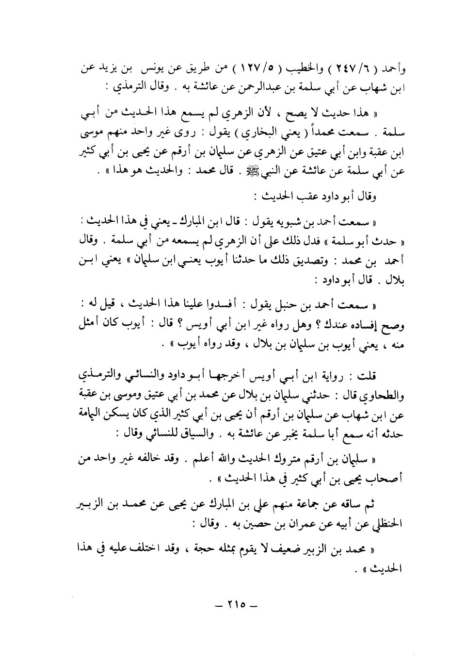 سمعت محمدا ـ يعنى البخارى ـ يقول: روى غير واحد منهم موسى بن عقبة وابن أبى عتيق عن الزهرى عن سليمان بن أرقم عن يحيى بن أبى كثير عن أبى سلمة عن عائشة عن النبى صلى الله عليه وسلم.
