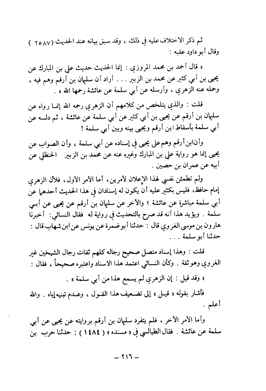 قلت: والذى يتلخص من كلامهم أن الزهرى رحمه الله إنما رواه عن سليمان بن أرقم عن يحيى بن أبى كثير عن أبى سلمة عن عائشة , ثم دلسه عن أبى سلمة بإسقاط ابن أرقم ويحيى بينه وبين أبى سلمة!.