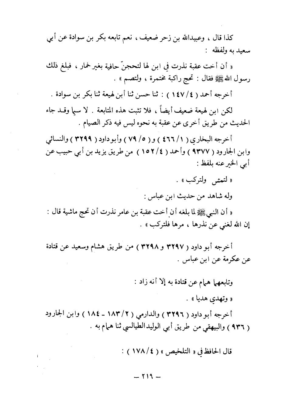 كذا قال , وعبيد الله بن زحر ضعيف , نعم تابعه بكر بن سوادة عن أبى سعيد به ولفظه: " أن أخت عقبة نذرت فى ابن لها لتحجن حافية بغير خمار , فبلغ ذلك رسول الله صلى الله عليه وسلم فقال: تحج راكبة مختمرة , ولتصم ".