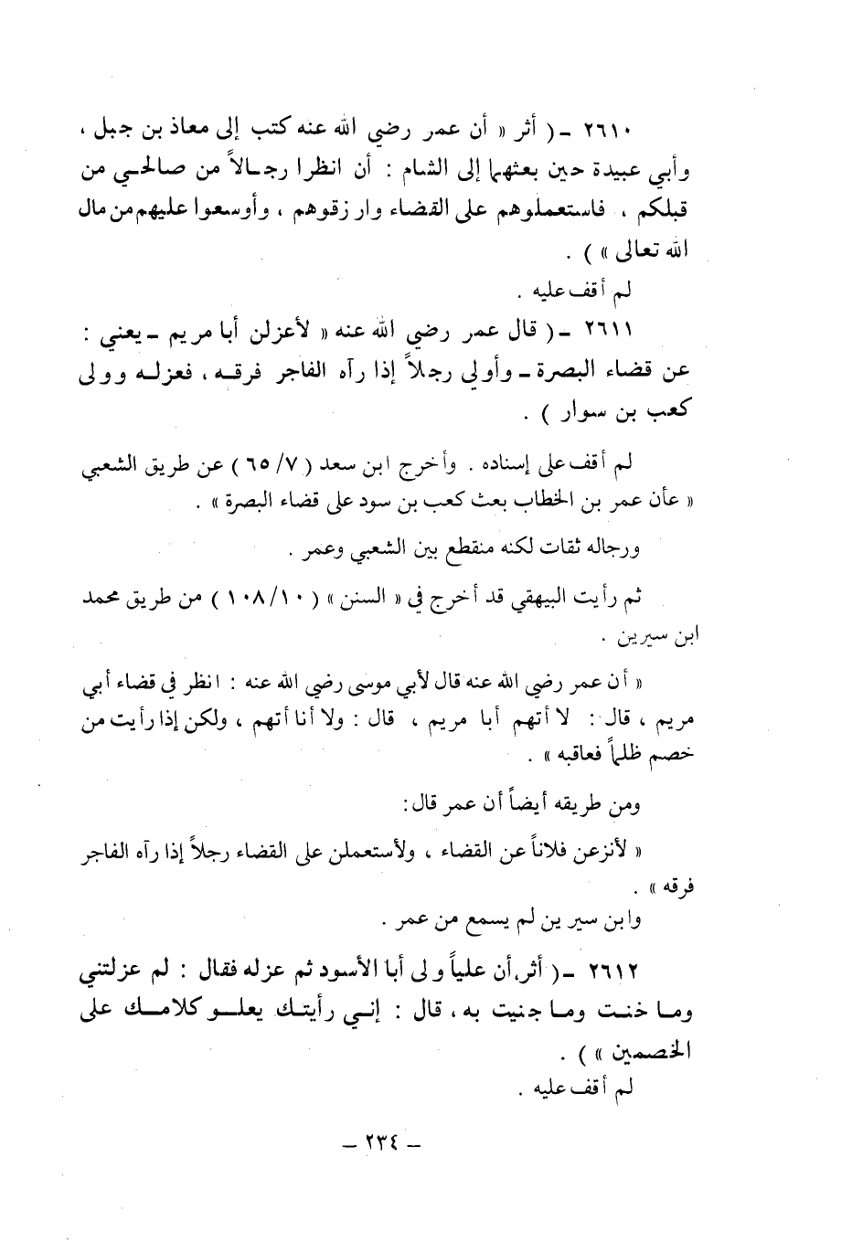 (2610) - (أثر: " أن عمر رضى الله عنه كتب إلى معاذ بن جبل , وأبى عبيدة حين بعثهما إلى الشام: أن انظرا رجالا من صالحى من قبلكم , فاستعملوهم على القضاء وارزقوهم , وأوسعوا عليهم من مال الله تعالى ".
