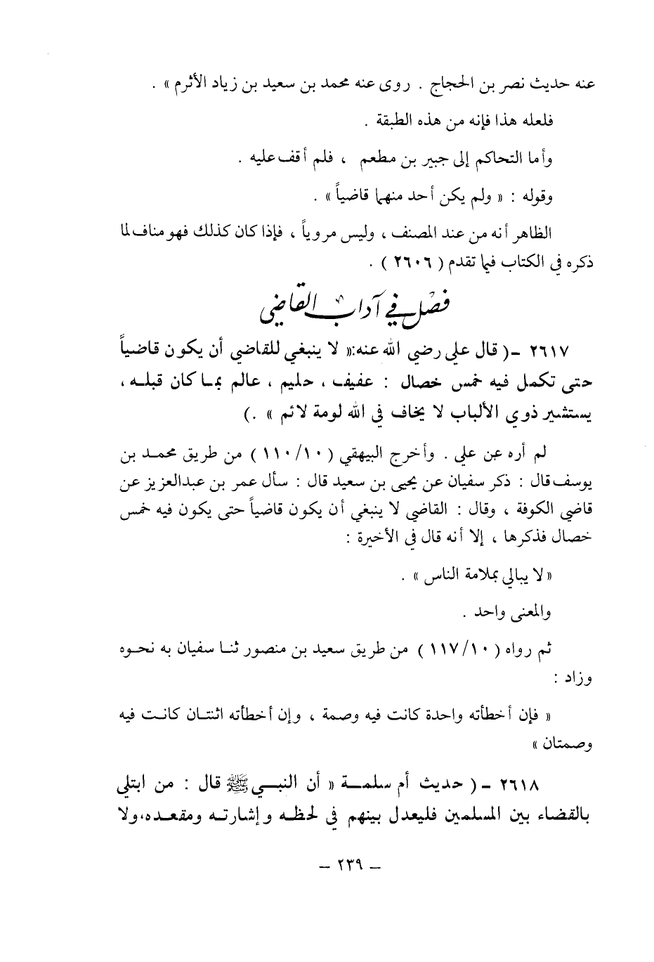 وأخرج البيهقى (10/110) من طريق محمد بن يوسف قال: ذكر سفيان عن يحيى بن سعيد قال: سأل عمر بن عبد العزيز عن قاضى الكوفة , وقال: القاضى لا ينبغى أن يكون قاضيا حتى يكون فيه خمس خصال فذكرها , إلا أنه قال فى الأخيرة: " لا يبالى بملامة الناس ".