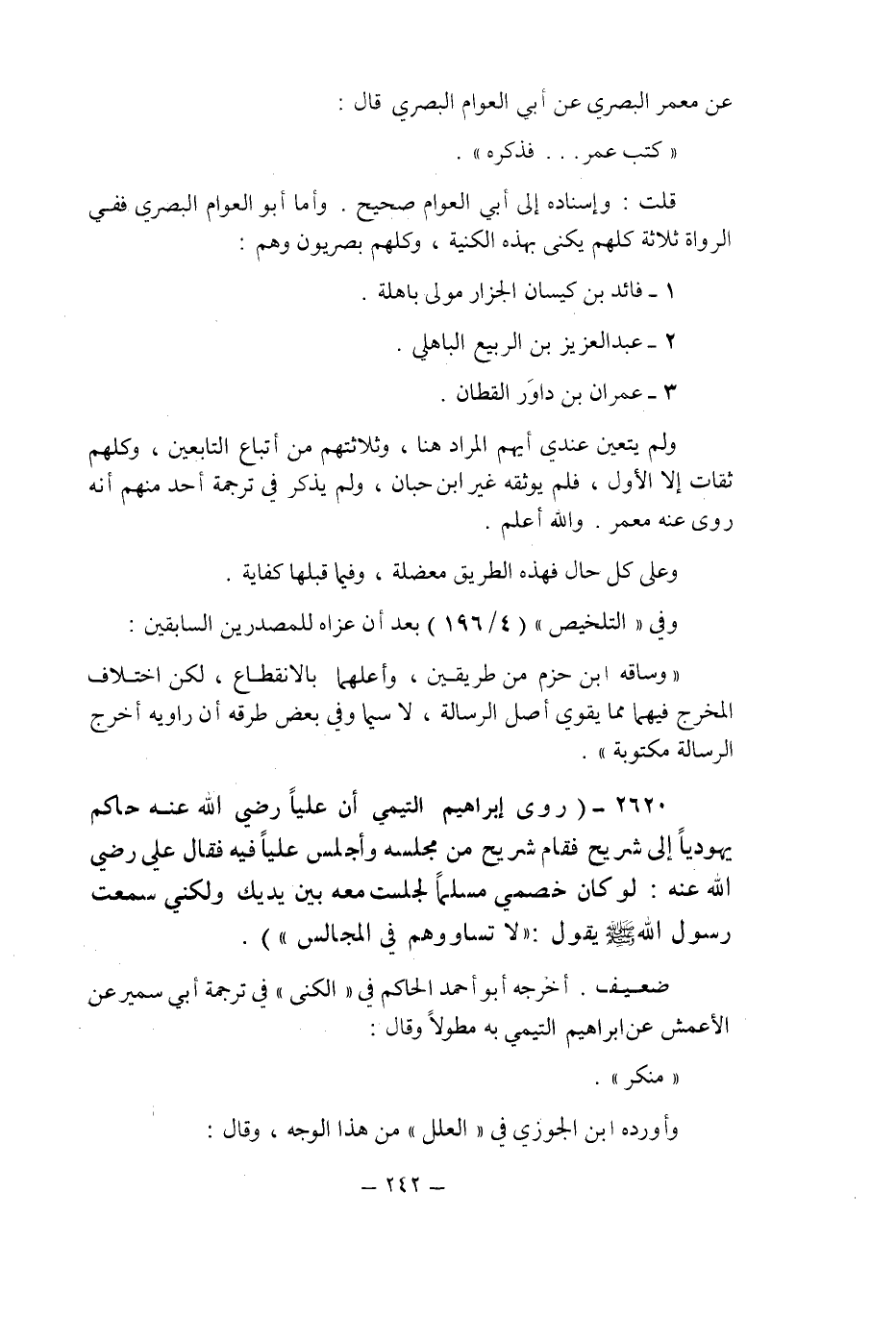 (2620) - (روى إبراهيم التيمى: أن عليا رضى الله عنه حاكم يهوديا إلى شريح فقام شريح من مجلسه وأجلس عليا فيه فقال على رضى الله عنه: لو كان خصمى مسلما لجلست معه بين يديك ولكنى سمعت رسول الله صلى الله عليه وسلم يقول: " لا تساووهم فى المجالس ".