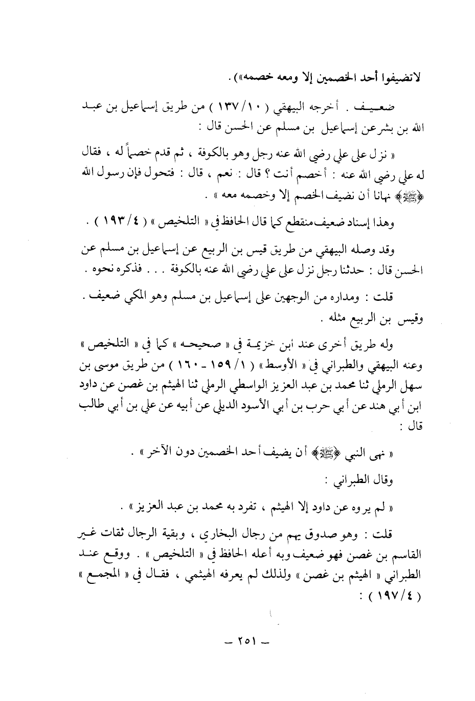 وله طريق أخرى عند ابن خزيمة فى " صحيحه " كما فى " التلخيص " وعنه البيهقى والطبرانى فى " الأوسط " (1/159 ـ 160) من طريق موسى بن سهل الرملى حدثنا محمد بن عبد العزيز الواسطى الرملى حدثنا الهيثم بن غصن عن داود ابن أبى هند عن أبى حرب بن أبى الأسود الديلى عن أبيه عن على بن أبى طالب قال: " نهى النبى صلى الله عليه وسلم أن يضيف أحد الخصمين دون الآخر ".