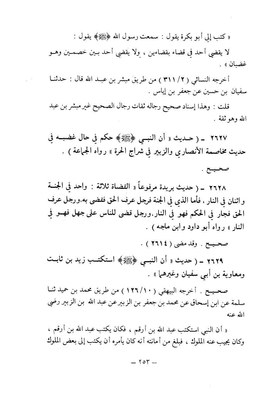 (2627) - (حديث: " أن النبى صلى الله عليه وسلم حكم فى حال غضبه فى حديث مخاصمة الأنصارى والزبير فى شراج الحرة " رواه الجماعة.