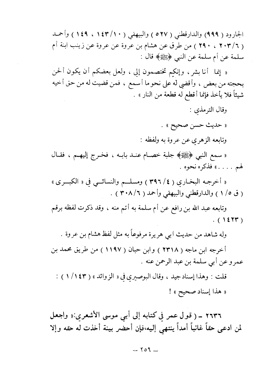 الجارود (999) والدارقطنى (527) والبيهقى (10/143 , 149) وأحمد (6/203 , 290) من طرق عن هشام بن عروة عن عروة عن زينب ابنة أم سلمة عن أم سلمة عن النبى صلى الله عليه وسلم قال: " إنما أنا بشر , وإنكم تختصمون إلى , ولعل بعضكم أن يكون ألحن بحجته من بعض , وأقضى له على نحو ما أسمع , فمن قضيت له من حق أخيه شيئا فلا يأخذ فإنما أقطع له قطعة من النار ".