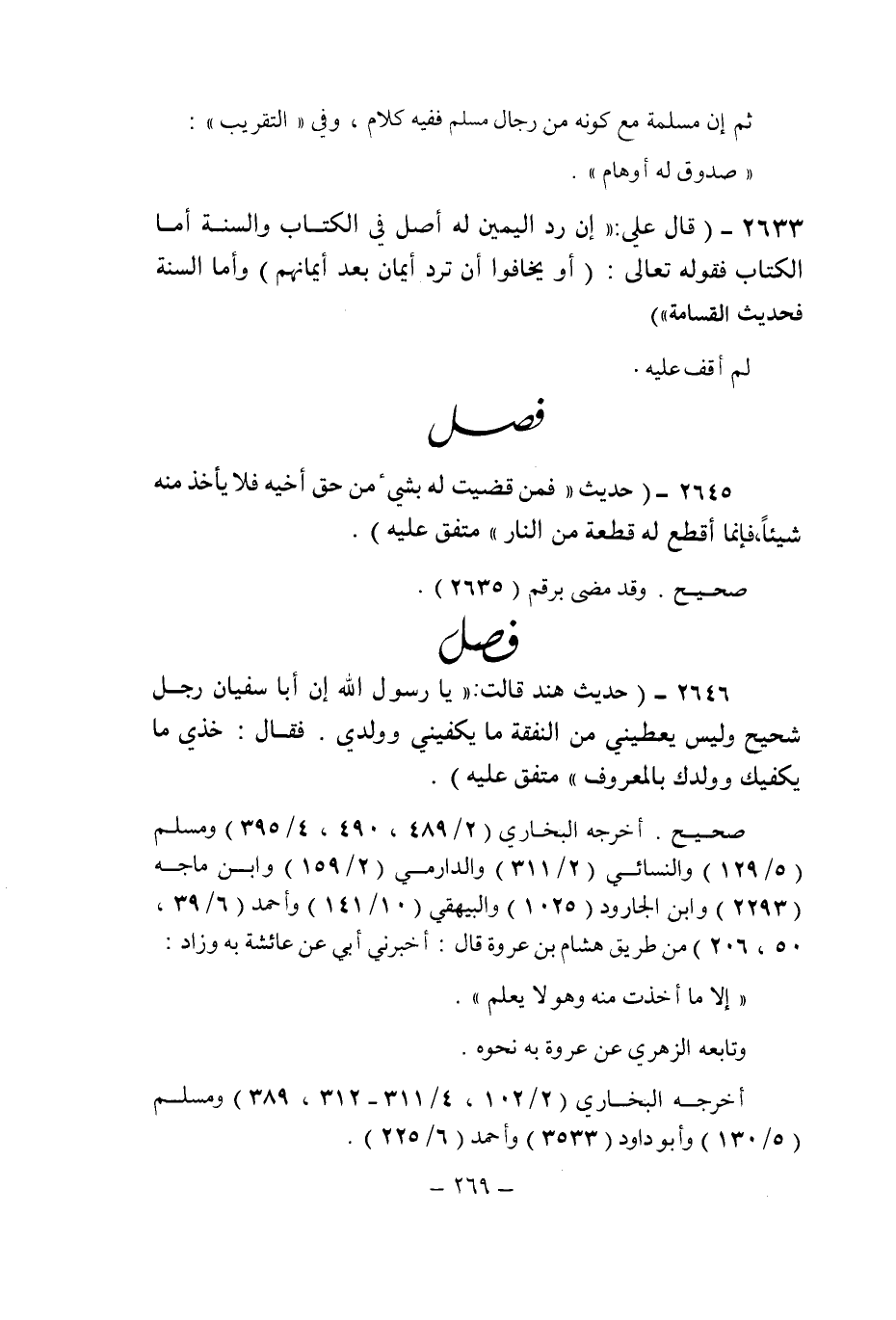 (2646) - (حديث هند قالت: " يا رسول الله إن أبا سفيان رجل شحيح وليس يعطينى من النفقة ما يكفينى وولدى. فقال: خذى ما يكفيك وولدك بالمعروف " متفق عليه.