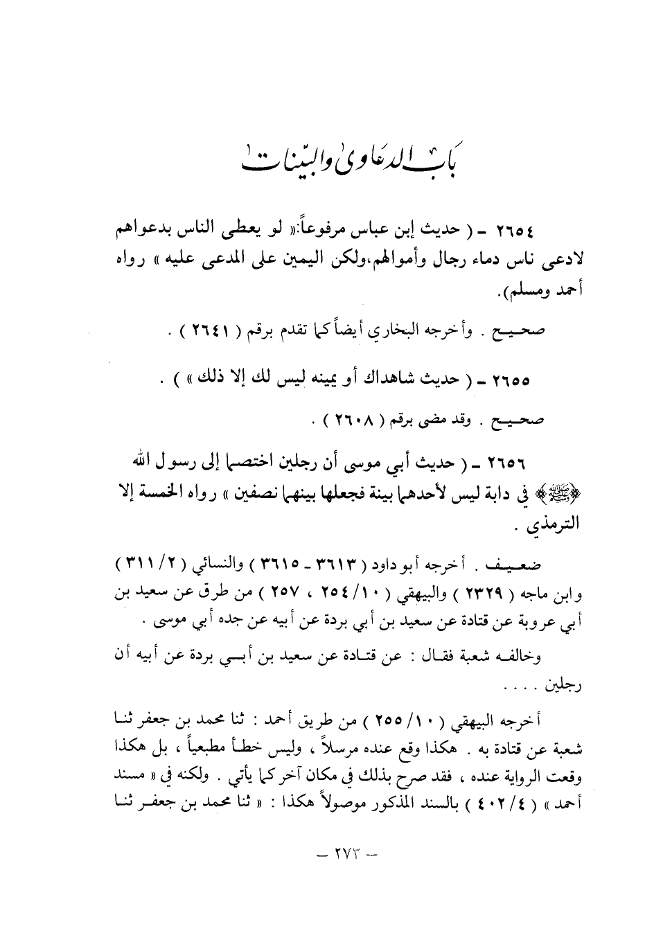 (2654) - (حديث ابن عباس مرفوعا: " لو يعطى الناس بدعواهم لادعى ناس دماء رجال وأموالهم , ولكن اليمين على المدعى عليه " رواه أحمد ومسلم.