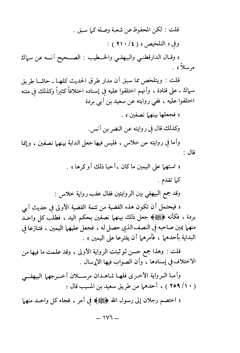 قلت: ويتلخص مما سبق أن مدار طرق الحديث كلها ـ حاشا طريق سماك ـ على قتادة , وأنهم اختلفوا عليه فى إسناده اختلافا كثيرا وكذلك فى متنه اختلفوا عليه , ففى روايته عن سعيد بن أبى بردة: " فجعلها بينهما نصفين ".