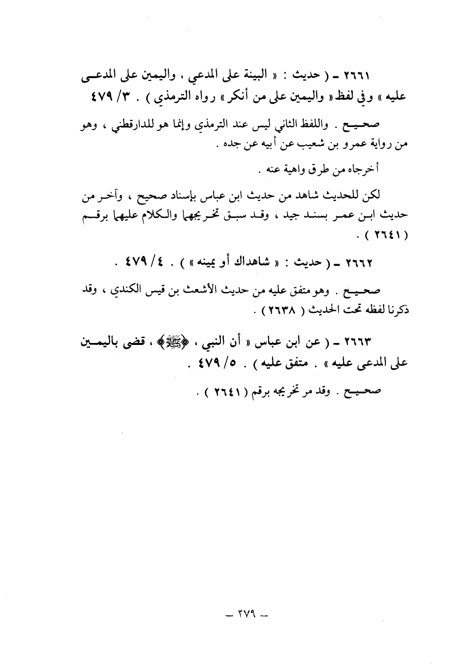 (2661) - (حديث: " البينة على المدعى , واليمين على المدعى عليه ". وفى لفظ: " واليمين على من أنكر " رواه الترمذى (3/479) .
