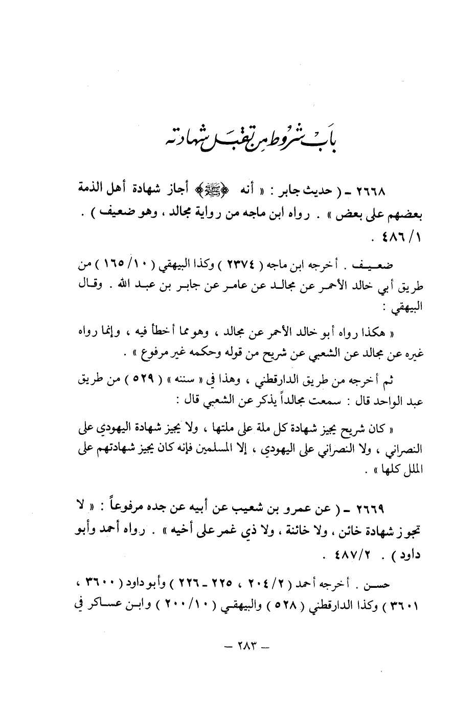 (2668) - (حديث جابر: " أنه صلى الله عليه وسلم أجاز شهادة أهل الذمة بعضهم على بعض " رواه ابن ماجه من رواية مجالد , وهو ضعيف (1/486) .