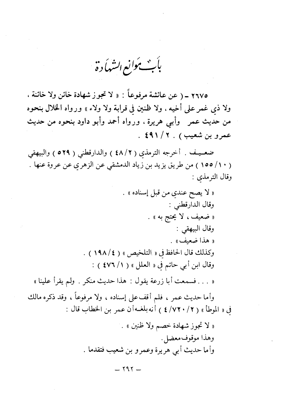 (2675) - (عن عائشة مرفوعا: " لا تجوز شهادة خائن ولا خائنة , ولا ذى غمر على أخيه , ولا ظنين فى قرابة ولا ولاء " ورواه الخلال بنحوه من حديث عمر وأبى هريرة. ورواه أحمد وأبو داود بنحوه من حديث عمرو بن شعيب (2/491) .