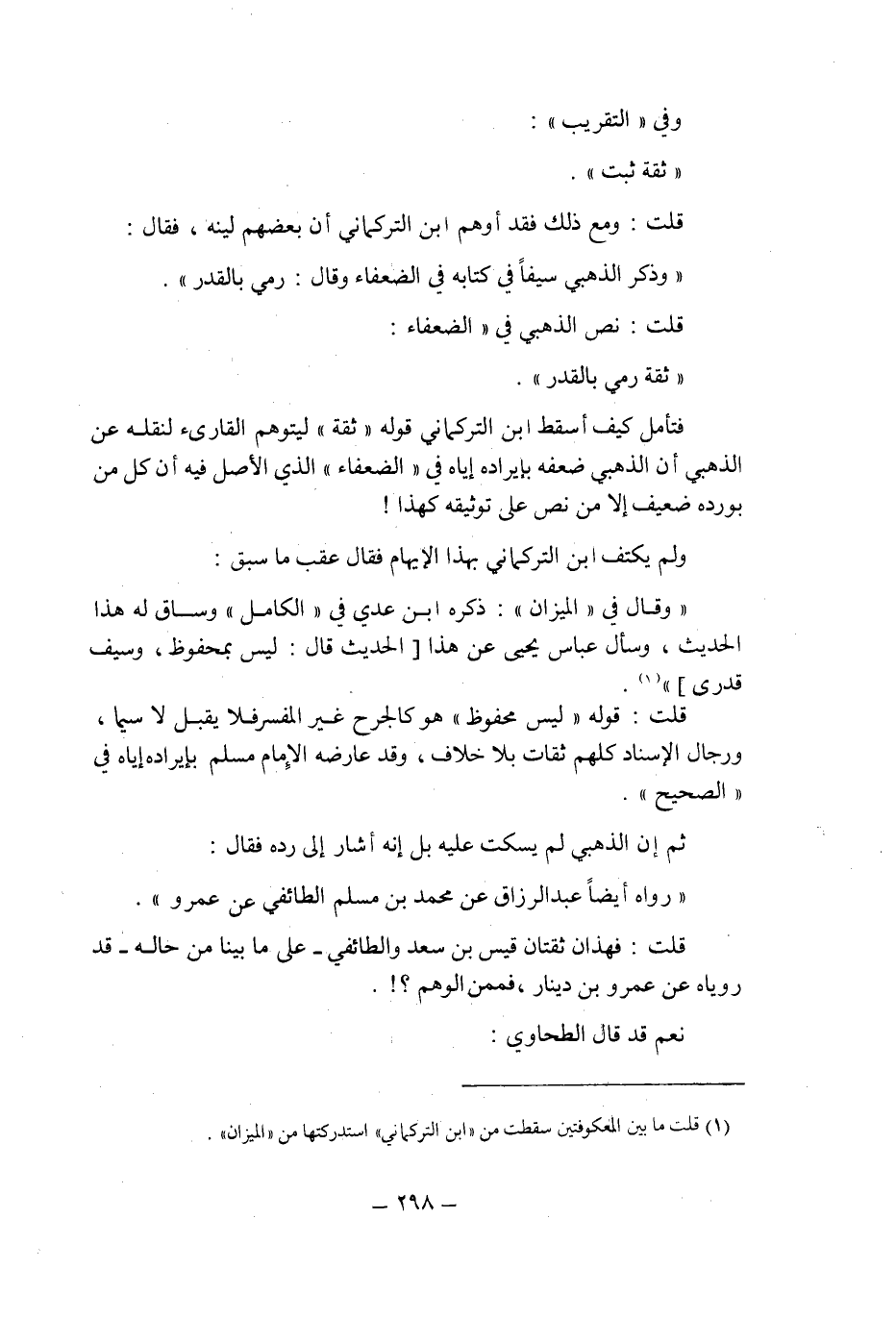 قلت: ومع ذلك فقد أوهم ابن التركمانى أن بعضهم لينه , فقال: " وذكر الذهبى سيفا فى كتابه فى الضعفاء وقال: رمى بالقدر ".