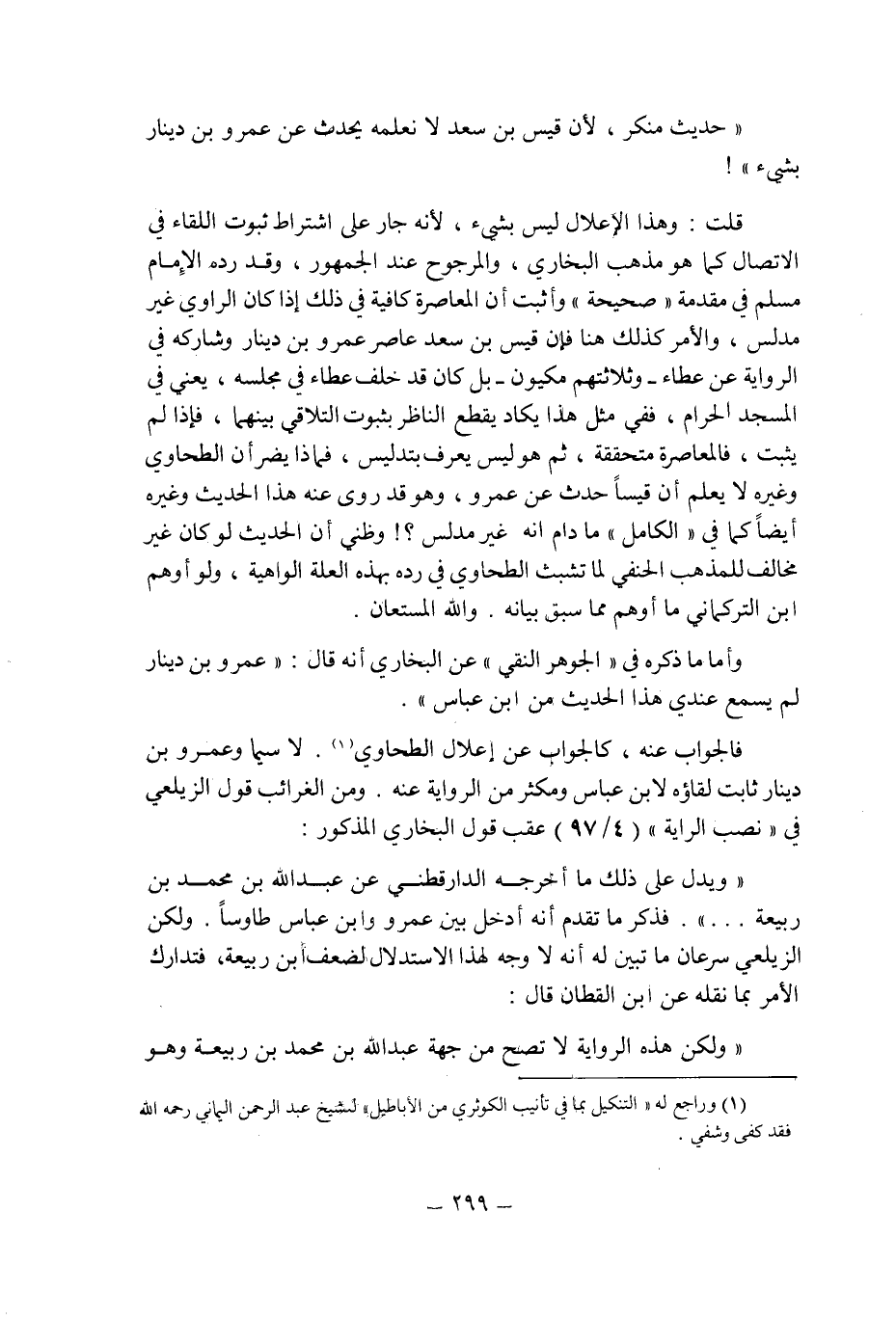 قلت: وهذا الإعلال ليس بشىء , لأنه جار على اشتراط ثبوت اللقاء فى الاتصال كما هو مذهب البخارى , والمرجوح عند الجمهور , وقد رده الإمام مسلم فى مقدمة " صحيحه " وأثبت أن المعاصرة كافية فى ذلك إذا كان الراوى غير مدلس , والأمر كذلك هنا فإن قيس بن سعد عاصر عمرو بن دينار وشاركه فى الرواية عن عطاء ـ وثلاثتهم مكيون ـ بل كان قد خلف عطاء فى مجلسه , يعنى فى المسجد الحرام , ففى مثل هذا يكاد يقطع الناظر بثبوت التلاقى بينهما , فإذا لم يثبت , فالمعاصرة متحققة , ثم هو ليس يعرف بتدليس , فماذا يضر أن الطحاوى وغيره لا يعلم أن قيسا حدث عن عمرو , وهو قد روى عنه هذا الحديث وغيره أيضا كما فى " الكامل " ما دام أنه غير مدلس؟ !