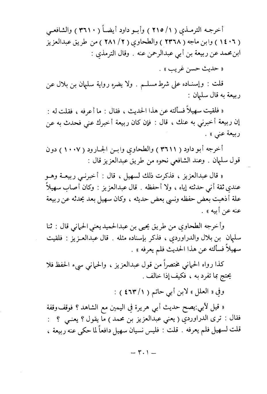 وفى " العلل " لابن أبى حاتم (1/463) : " قيل لأبى: يصح حديث أبى هريرة فى اليمين مع الشاهد؟ فوقف وقفة فقال: ترى الدراوردى (يعنى عبد العزيز بن محمد) ما يقول؟ يعنى؟: قلت لسهيل فلم يعرفه.