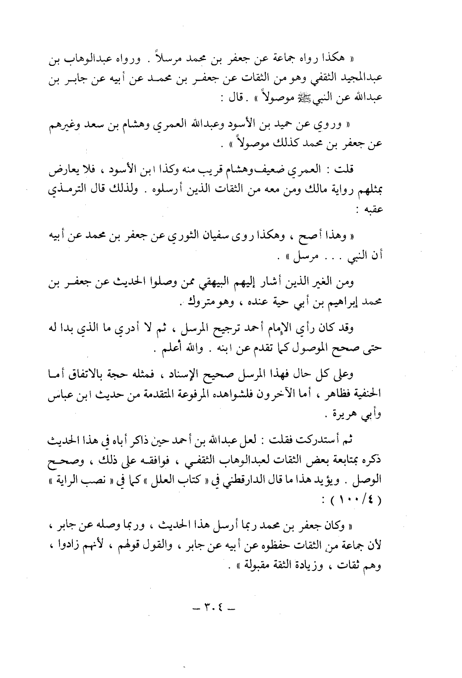 ويؤيد هذا ما قال الدارقطنى فى " كتاب العلل " كما فى " نصب الراية " (4/100) : " وكان جعفر بن محمد ربما أرسل هذا الحديث , وربما وصله عن جابر , لأن جماعة من الثقات حفظوه عن أبيه عن جابر , والقول قولهم , لأنهم زادوا , وهم ثقات , وزيادة الثقة مقبولة ".