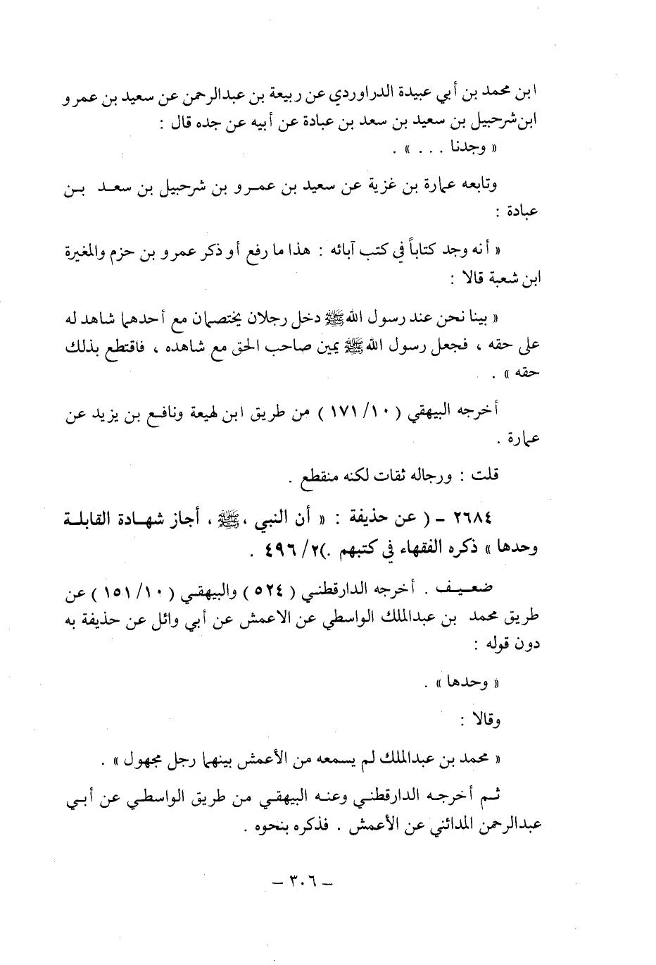 (2684) - (عن حذيفة: " أن النبى صلى الله عليه وسلم , أجاز شهادة القابلة وحدها " ذكره الفقهاء فى كتبهم (2/496) .