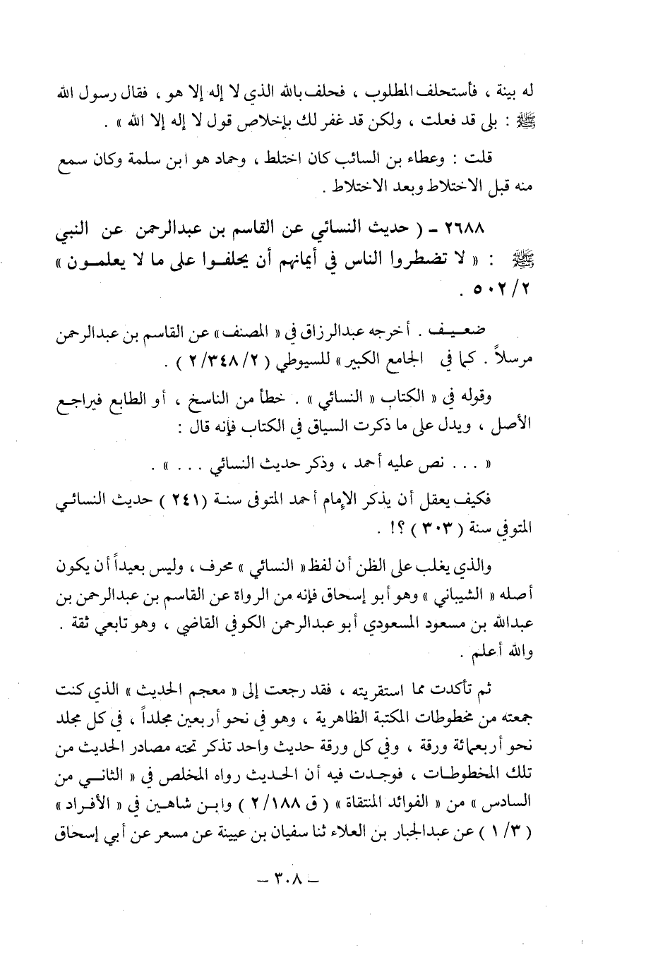 (2688) - (حديث النسائى عن القاسم بن عبد الرحمن عن النبى صلى الله عليه وسلم: " لا تضطروا الناس فى أيمانهم أن يحلفوا على ما لا يعلمون " (2/502) .