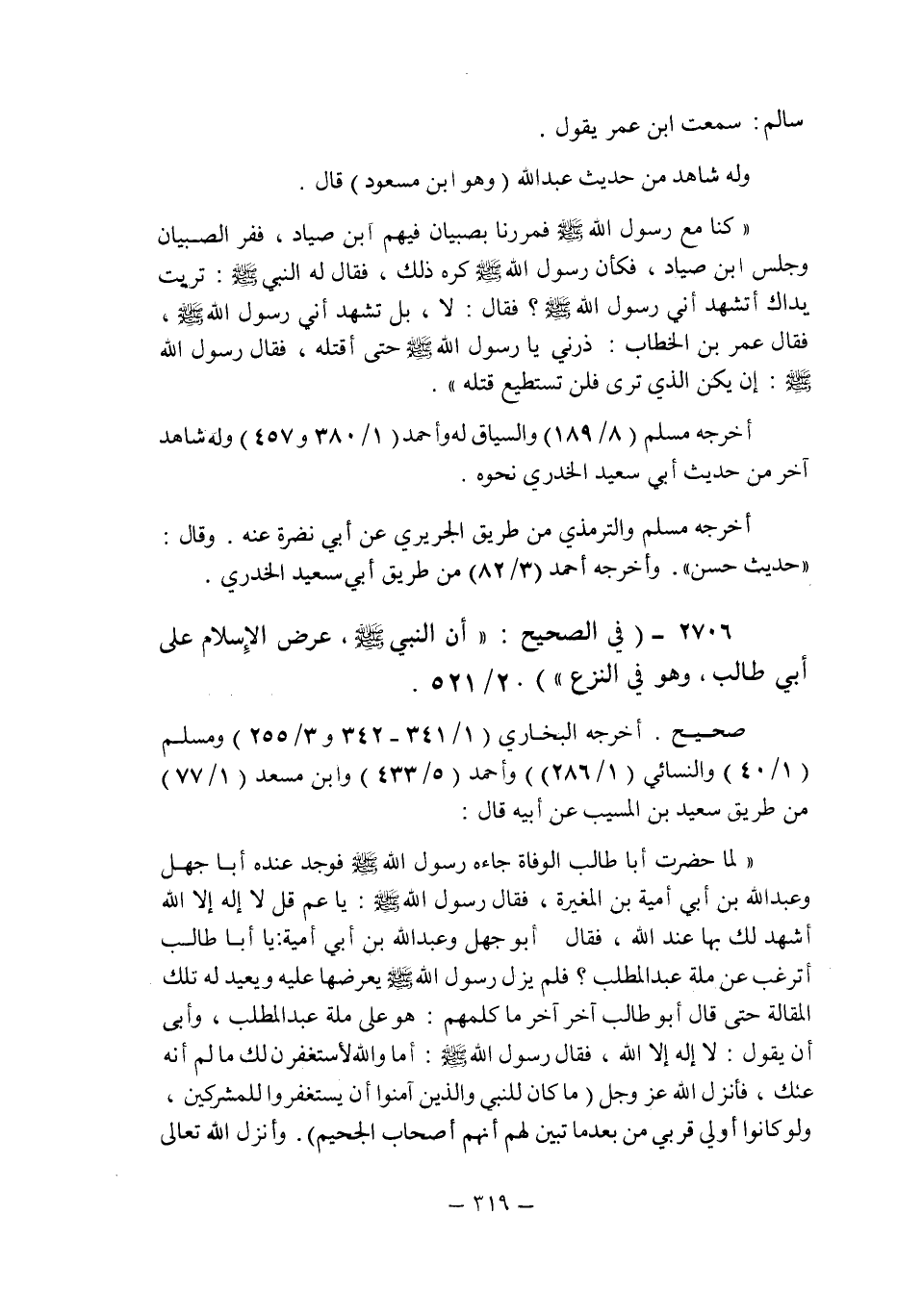 (2706) - (فى الصحيح: " أن النبى صلى الله عليه وسلم , عرض الإسلام على أبى طالب , وهو فى النزع " (2/521) .