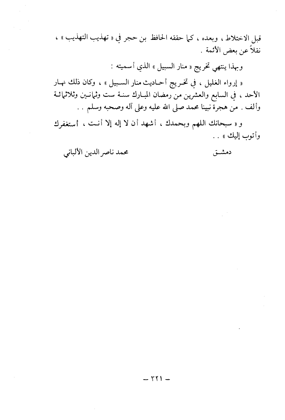 وبهذا ينتهى تخريج " منار السبيل " الذى أسميته: " إرواء الغليل , فى تخريج أحاديث منار السبيل " , وكان ذلك نهار الأحد , فى السابع والعشرين من رمضان المبارك سنة ست وثمانين وثلاثمائة وألف , من هجرة نبينا محمد صلى الله عليه وعلى آله وصحبه وسلم.