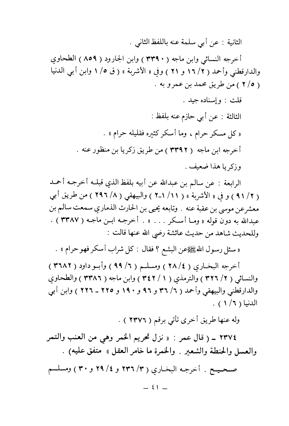 الثالثة: عن أبى حازم عنه بلفظ: " كل مسكر حرام , وما أسكر كثيرة فقليله حرام " أخرجه ابن ماجه (3392) من طريق زكريا بن منظور عنه.