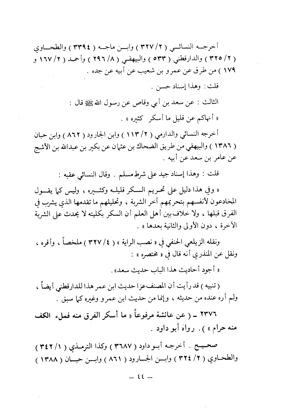 ونقله الز يلعى الحنفى فى " نصب الراية " (4/327) ملخصا , وأقره , ونقل عن المنذرى أنه قال فى " مختصره ": " أجود أحاديث هذا الباب حديث سعد ".