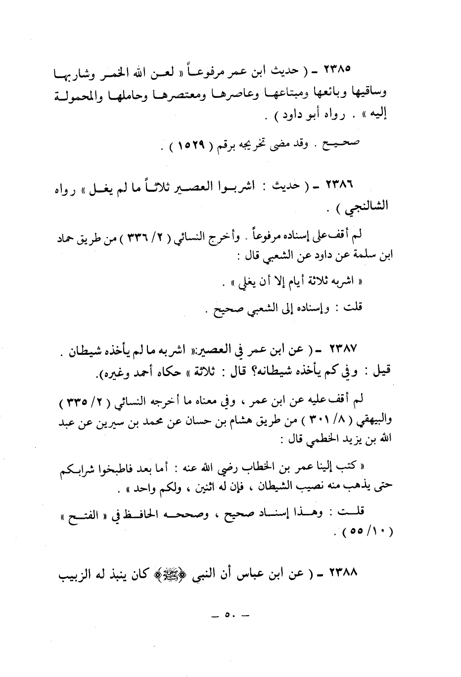 (2387) - (عن ابن عمر فى العصير: " اشربه ما لم يأخذه شيطان , قيل: وفى كم يأخذه شيطانه؟ قال: ثلاثة " حكاه أحمد وغيره.