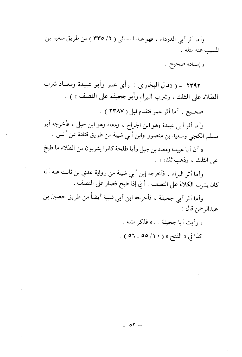 (2392) - (قال البخارى: " رأى عمر وأبو عبيدة ومعاذ شرب الطلاء على الثلث , وشرب البراء وأبو جحيفة على النصف ".