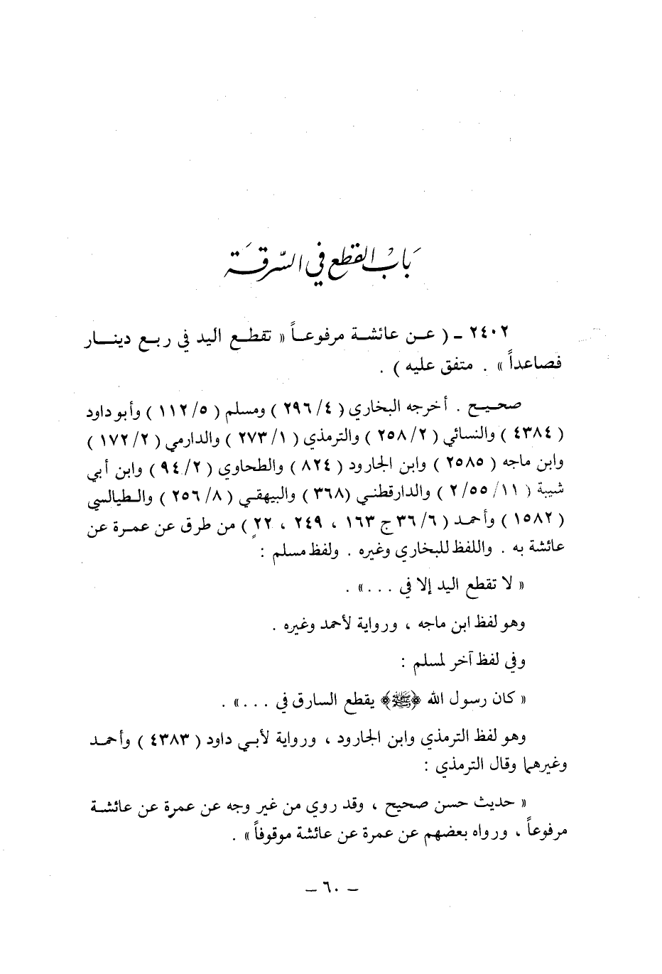 (2402) - (عن عائشة مرفوعا: " تقطع اليد فى ربع دينار فصاعدا " متفق عليه.