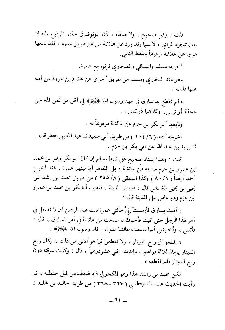 قلت: وهذا إسناد صحيح على شرط مسلم إن كان أبو بكر وهو ابن محمد ابن عمرو بن حزم سمعه من عائشة , بل الظاهر أن بينهما عمرة , فقد أخرج أحمد أيضا (6/80) وكذا البيهقى (8/255) من طريق محمد بن راشد عن يحيى بن يحيى الغسانى قال: قدمت المدينة , فلقيت أبا بكر بن محمد بن عمرو بن حزم وهو عامل على المدينة قال: " أتيت بسارق فأرسلت إلى خالتى عمرة بنت عبد الرحمن أن لا تعجل فى أمر هذا الرجل حتى آتيك فأخبرك ما سمعت من عائشة فى أمر السارق , قال: فأتنى , وأخبرتنى أنها سمعت عائشة تقول: قال رسول الله صلى الله عليه وسلم: " اقطعوا فى ربع الدنيار , ولا تقطعوا فيما هو أدنى من ذلك , وكان ربع الدينار يومئذ ثلاثة دراهم , والدينار أثنى عشر درهما , قال: وكانت سرقته دون الربع فلم أقطعه ".