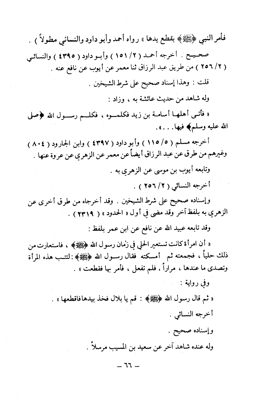 وقد تابعه عبيد الله عن نافع عن ابن عمر بلفظ: " أن امرأة كانت تستعير الحلى فى زمان رسول الله صلى الله عليه وسلم , فاستعارت من ذلك حليا , فجمعته ثم أمسكته فقال رسول الله صلى الله عليه وسلم: لتتب هذه المرأة وتصدى ما عندها , مرارا , فلم تفعل , فأمر بها فقطعت ".