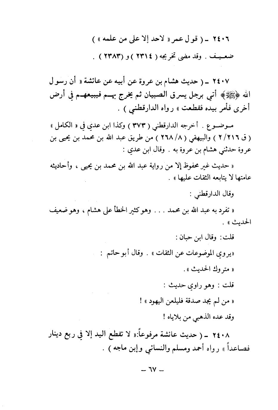 (2407) - (حديث هشام بن عروة عن أبيه عن عائشة: " أن رسول الله صلى الله عليه وسلم أتى برجل يسرق الصبيان ثم يخرج بهم فيبيعهم فى أرض أخرى فأمر بيده فقطعت " رواه الدارقطنى.