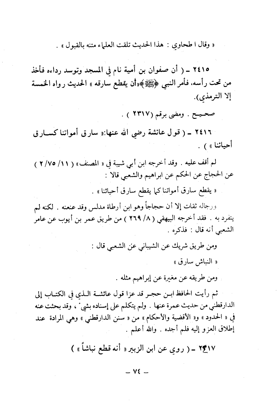 ثم رأيت الحافظ ابن حجر قد عزا قول عائشة الذى فى كتاب إلى الدارقطنى من حديث عمرة عنها , ولم يتكلم على إسناده بشىء , وقد بحثت عنه فى " الحدود " و" الأقضية والأحكام " من " سنن الدارقطنى " وهى المراد عند إطلاق العزو إليه فلم أجده , والله أعلم.