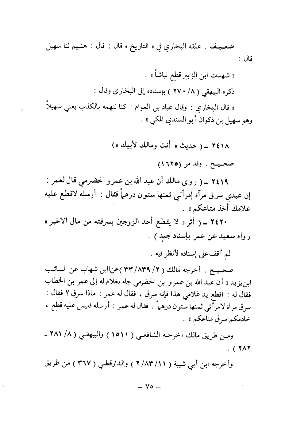 (2419) - (روى مالك أن عبد الله بن عمرو الحضرمى قال لعمر: إن عبدى سرق مرآة امرأتى ثمنها ستون درهما فقال: أرسله لا قطع عليه غلامك أخذ متاعكم ".