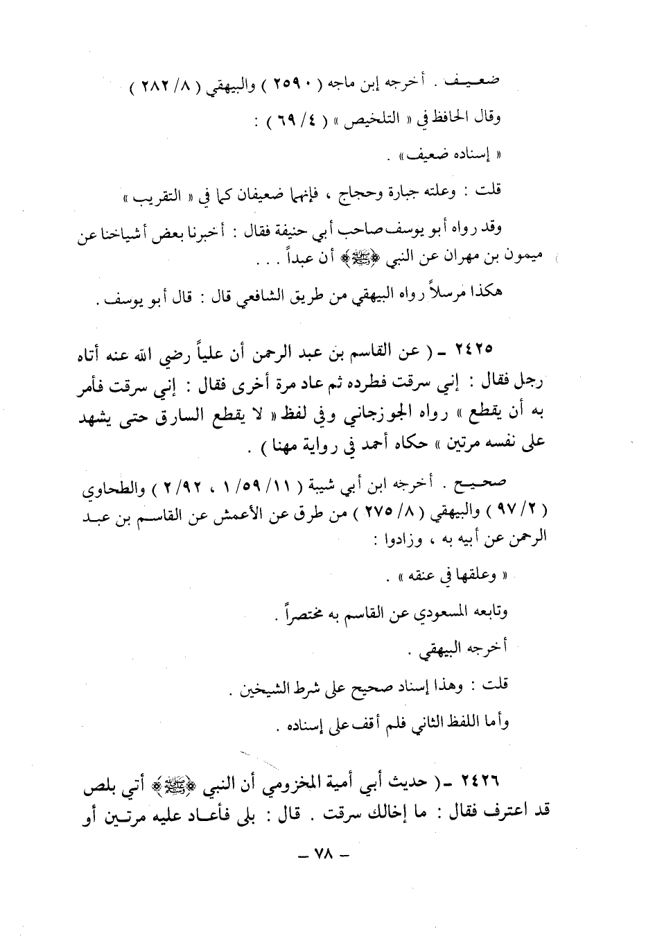 (2425) - (عن القاسم بن عبد الرحمن أن عليا رضى الله عنه أتاه رجل فقال: " إنى سرقت فطرده ثم عاد مرة أخرى فقال: إنى سرقت فأمر به أن يقطع " رواه الجوزجانى وفى لفظ: " لا يقطع السارق حتى يشهد على نفسه مرتين " حكاه أحمد فى رواية مهنا.