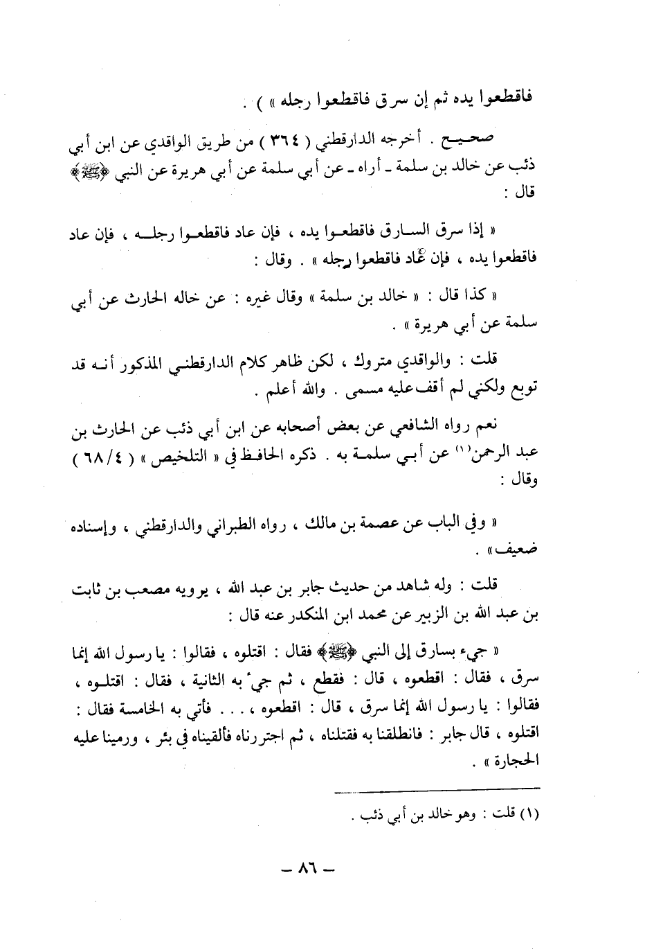 أخرجه الدارقطني (364) من طريق الواقدي عن ابن أبي ذئب عن خالد بن سلمة - أراه - عن أبي سلمة عن أبي هريرة عن النبي صلى الله عليه وسلم قال: " إذا سرق السارق فاقطعوا يده , فإن عاد فاقطعوا رجله , فإن عاد فاقطعوا يده , فإن عاد فاقطعوا رجله " , وقال: كذا قال: خالد بن سلمة , وقال غيره: عن خاله الحارث عن أبي سلمة عن أبي هريرة.