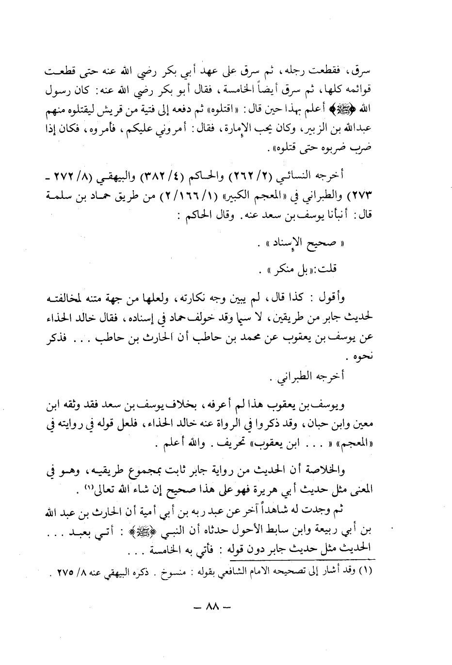 وأقول: كذا قال , لم يبين وجه نكارته , ولعلها من جهة متنه لمخالفته لحديث جابر من طريقين , لا سيما وقد خولف حماد في إسناده , فقال خالد الحذاء عن يوسف بن يعقوب عن محمد بن حاطب أن الحارث بن حاطب.... فذكر نحوه.