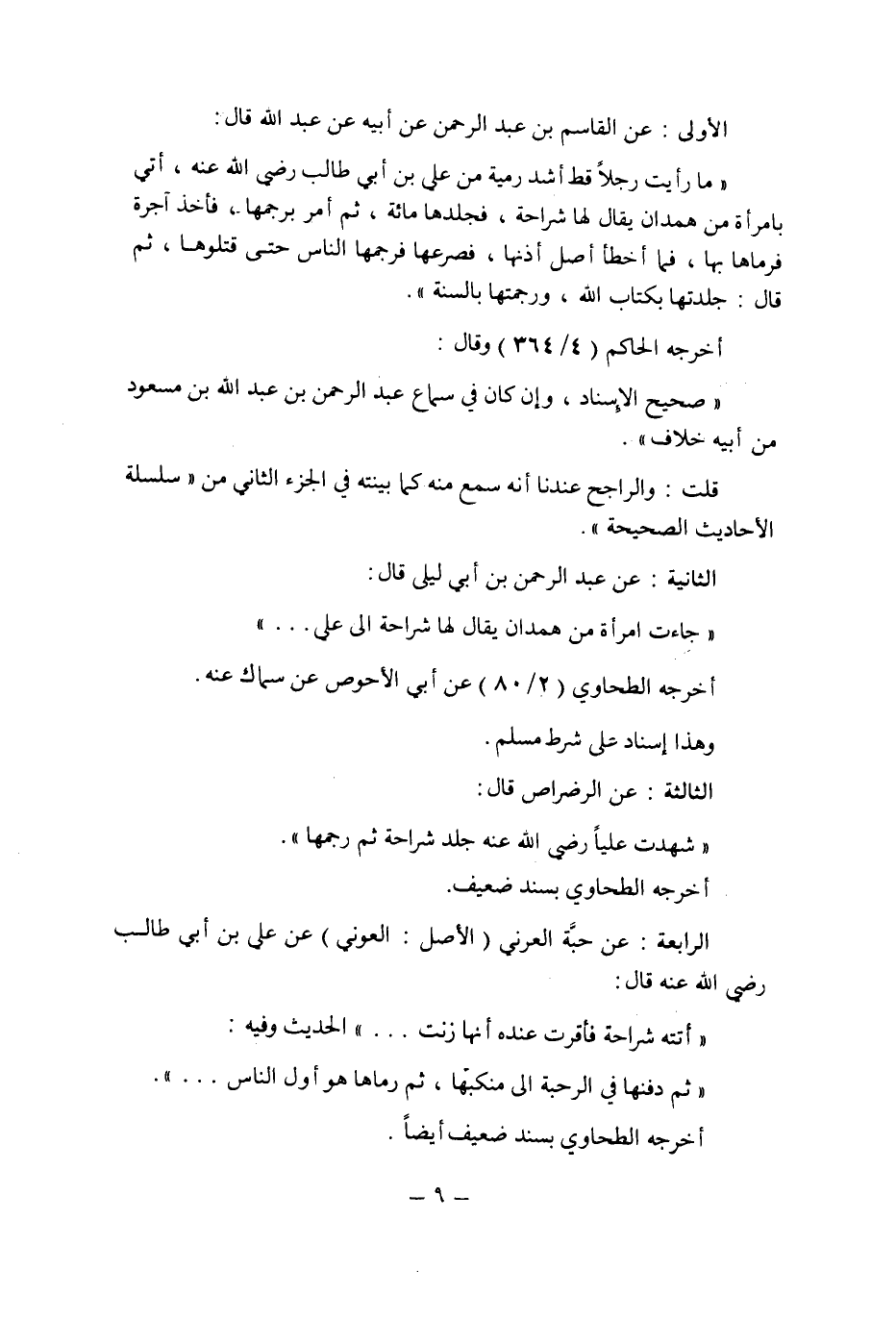 الأولى: عن القاسم بن عبد الرحمن عن أبيه عن عبد الله قال: " ما رأيت رجلا قط أشد رمية من على بن أبى طالب رضى الله عنه , أتى بامرأة من همدان يقال لها شراحة , فجلدها مائة , ثم أمر برجمها , فأخذ آجرة فرماها بها , فما أخطأ أصل أذنها , فصرعها الناس حتى قتلوها , ثم قال: جلدتها بكتاب الله , ورجمتها بالسنة " أخرجه الحاكم (4/364) وقال: " صحيح الإسناد , وإن كان فى سماع عبد الرحمن بن عبد الله بن مسعود من أبيه خلاف ".