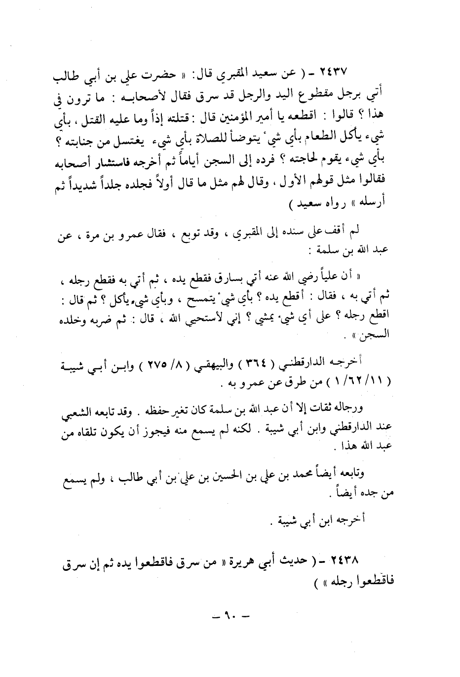 (2437) - (عن سعيد المقبرى قال: " حضرت على بن أبى طالب أتى برجل مقطوع اليد والرجل قد سرق فقال لأصحابه: ما ترون فى هذا؟ قالوا: اقطعه يا أمير المؤمنين قال: قتلته إذا وما عليه القتل , بأى شىء يأكل الطعام بأى شىء يتوضأ للصلاة بأى شىء يغتسل من جنابته؟ بأى شىء يقوم لحاجته؟ فرده إلى السجن أياما ثم أخرجه فاستشار أصحابه فقالوا مثل قولهم الأول , وقال لهم مثل ما قال أولا فجلده جلدا شديدا ثم أرسله " رواه سعيد.