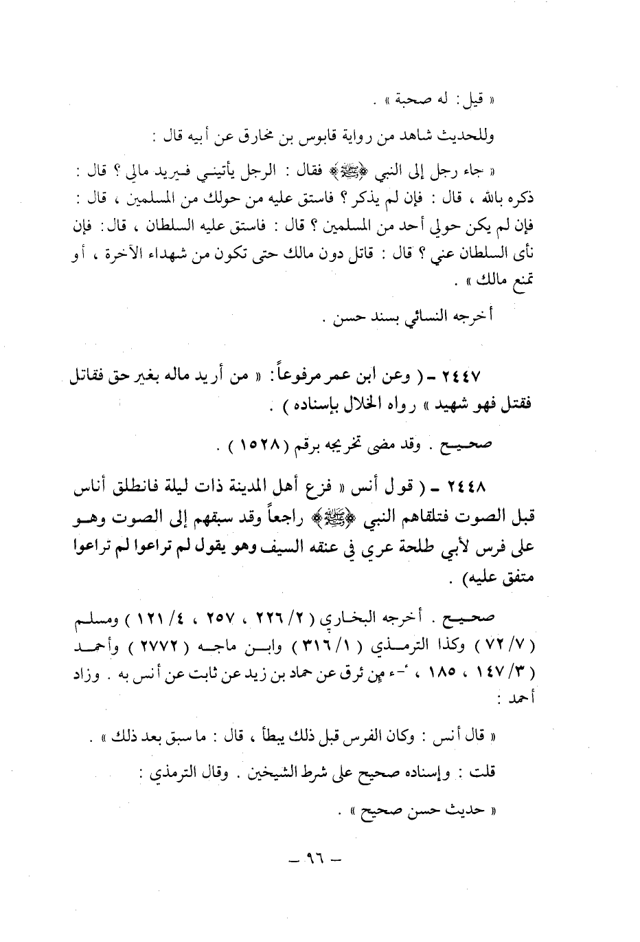(2447) - (وعن ابن عمر مرفوعا: " من أريد ماله بغير حق فقاتل فقتل فهو شهيد " رواه الخلال بإسناده.