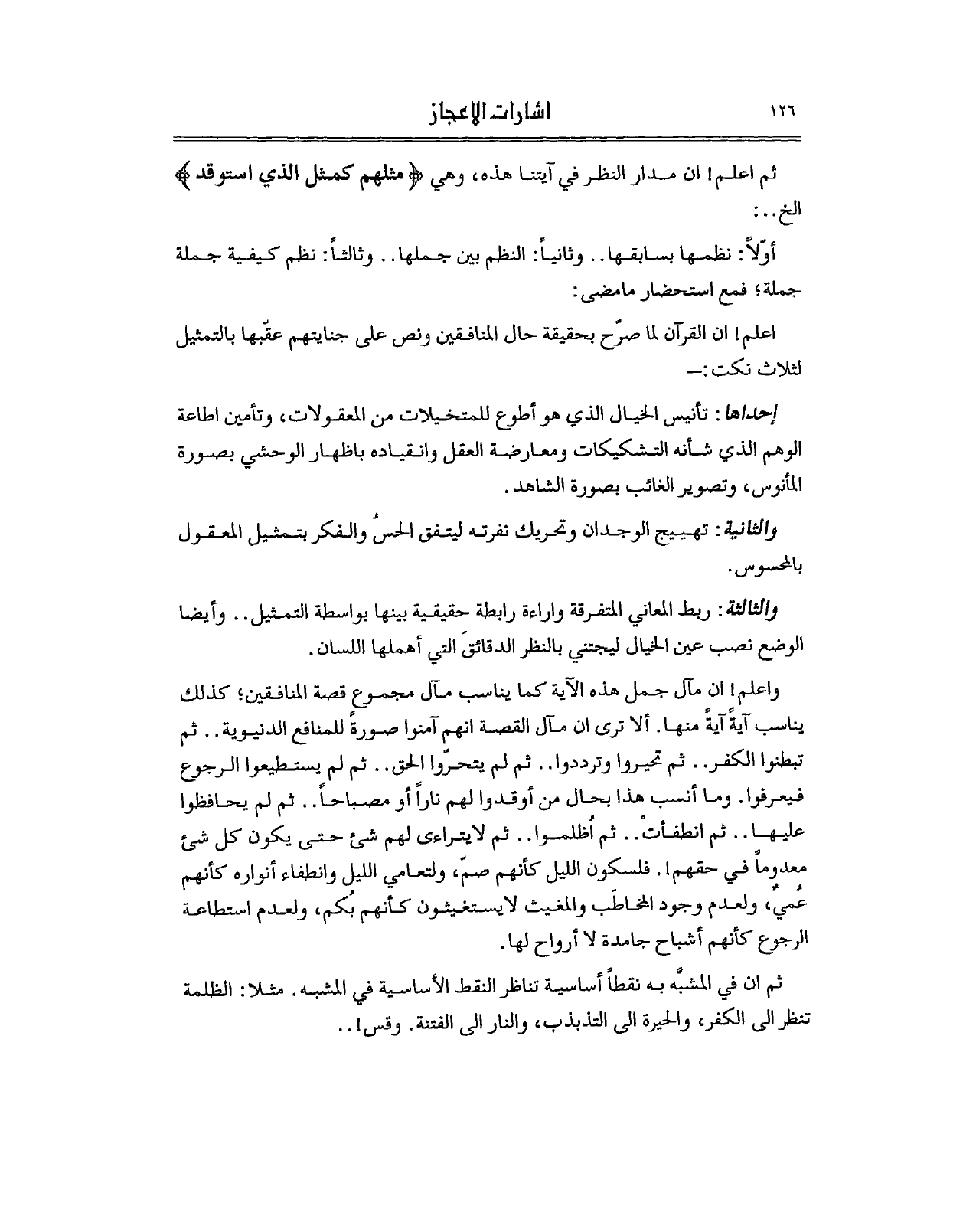 ثم اعلم! ان مدار النظر في آيتنا هذه، وهي (مثلهم كمثل الذي استوقد) الخ..:
