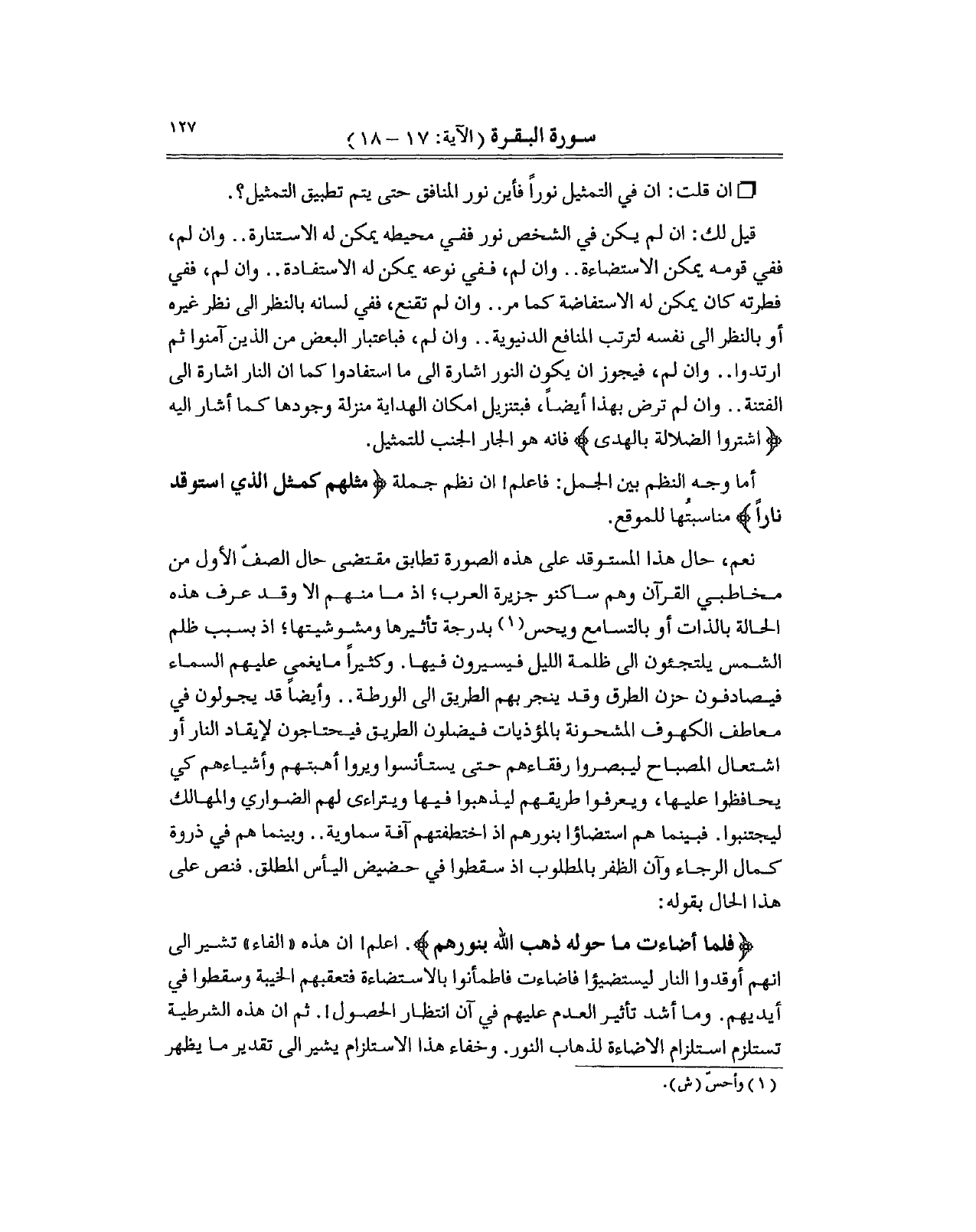 قيل لك: ان لم يكن في الشخص نور ففي محيطه يمكن له الاستنارة.. وان لم، ففي قومه يمكن الاستضاءة.. وان لم، ففي نوعه يمكن له الاستفادة.. وان لم، ففي فطرته كان يمكن له الاستفاضة كما مر.. وان لم تقنع، ففي لسانه بالنظر الى نظر غيره أو بالنظر الى نفسه لترتب المنافع الدنيوية.. وان لم، فباعتبار البعض من الذين آمنوا ثم ارتدوا.. وان لم، فيجوز ان يكون النور اشارة الى ما استفادوا كما ان النار اشارة الى الفتنة.. وان لم ترض بهذا أيضاً، فبتنزيل امكان الهداية منزلة وجودها كما أشار اليه اشتروا الضلالة بالهدى فانه هو الجار الجنب للتمثيل.