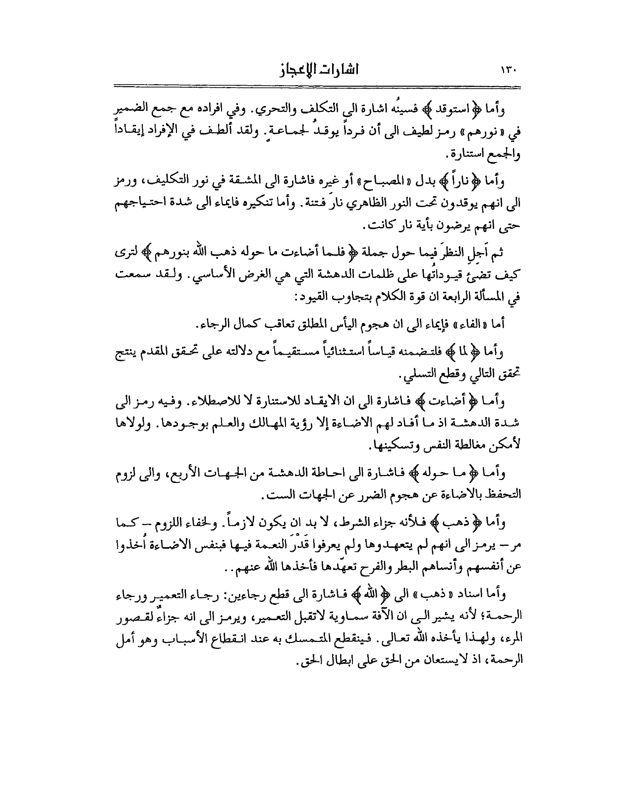 ثم اَجِلِ النظرَ فيما حول جملة (فلما أضاءت ما حوله ذهب الله بنورهم) لترى كيف تضئ قيوداتُها على ظلمات الدهشة التي هي الغرض الأساسي. ولقد سمعت في المسألة الرابعة ان قوة الكلام بتجاوب القيود:
