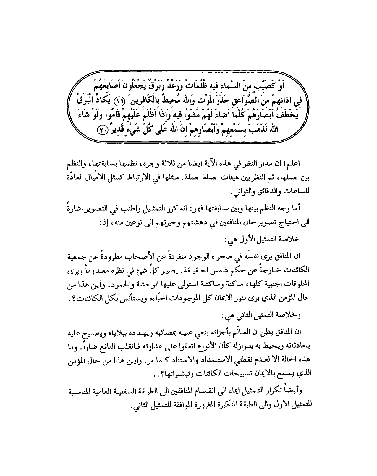 أما وجه النظم بينها وبين سابقتها فهو: انه كرر التمثيل واطنب في التصوير اشارةً الى احتياج تصوير حال المنافقين في دهشتهم وحيرتهم الى نوعين منه، إذ: