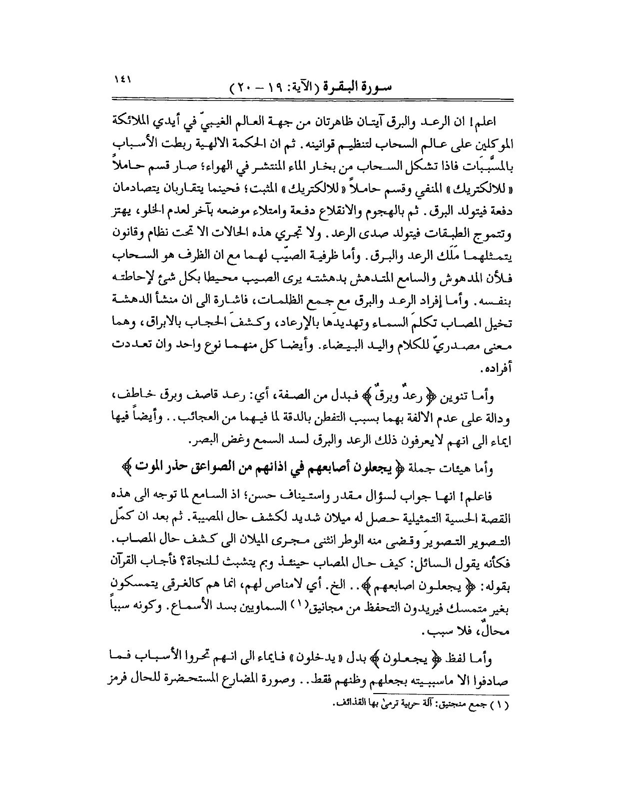 اعلم! ان الرعد والبرق آيتان ظاهرتان من جهة العالم الغيبيّ في أيدي الملائكة الموكلين على عالم السحاب لتنظيم قوانينه. ثم ان الحكمة الالهية ربطت الأسباب بالمسَّببَات فاذا تشكل السحاب من بخار الماء المنتشر في الهواء؛ صار قسم حاملاً "للالكتريك" المنفي وقسم حاملاً "للالكتريك" المثبت؛ فحينما يتقاربان يتصادمان دفعة فيتولد البرق. ثم بالهجوم والانقلاع دفعة وامتلاء موضعه بآخر لعدم الخلو، يهتز وتتموج الطبقات فيتولد صدى الرعد. ولا تجري هذه الحالات الا تحت نظام وقانون يتمثلهما مَلَك الرعد والبرق. وأما ظرفية الصيّب لهما مع ان الظرف هو السحاب فلأن المدهوش والسامع المتدهش بدهشته يرى الصيب محيطا بكل شئ لإحاطته بنفسه. وأما إفراد الرعد والبرق مع جمع الظلمات، فاشارة الى ان منشأ الدهشة تخيل المصاب تكلمَ السماء وتهديدَها بالإرعاد، وكشفَ الحجاب بالابراق، وهما معنى مصدريّ للكلام واليد البيضاء. وأيضا كل منهما نوع واحد وان تعددت أفراده.